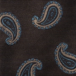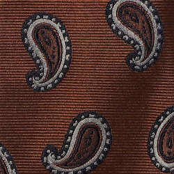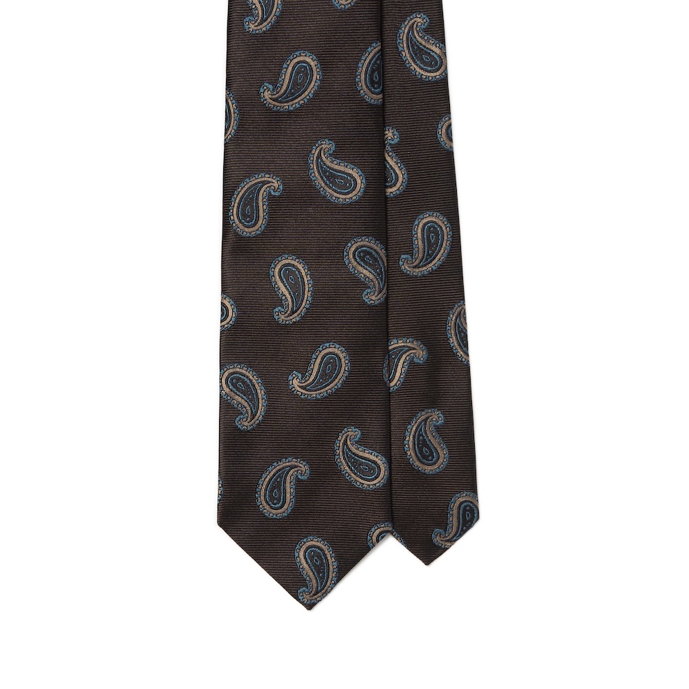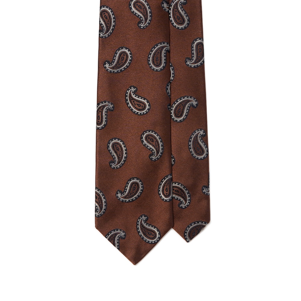 묵직한 에스프레소 브라운과 오렌지에 가까운 브릭 브라운 컬러 바탕 위에 파란색이 살짝 얹힌 페이즐리 타이는 겨울철 브이존에 강약의 균형을 더해줍니다. 광택감 있는 실크 직조 덕분에 포멀한 자리에 특히 추천할 만한 넥타이입니다.