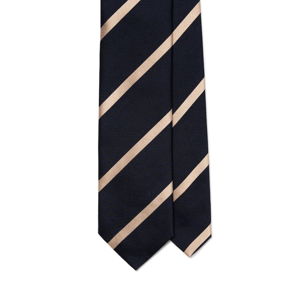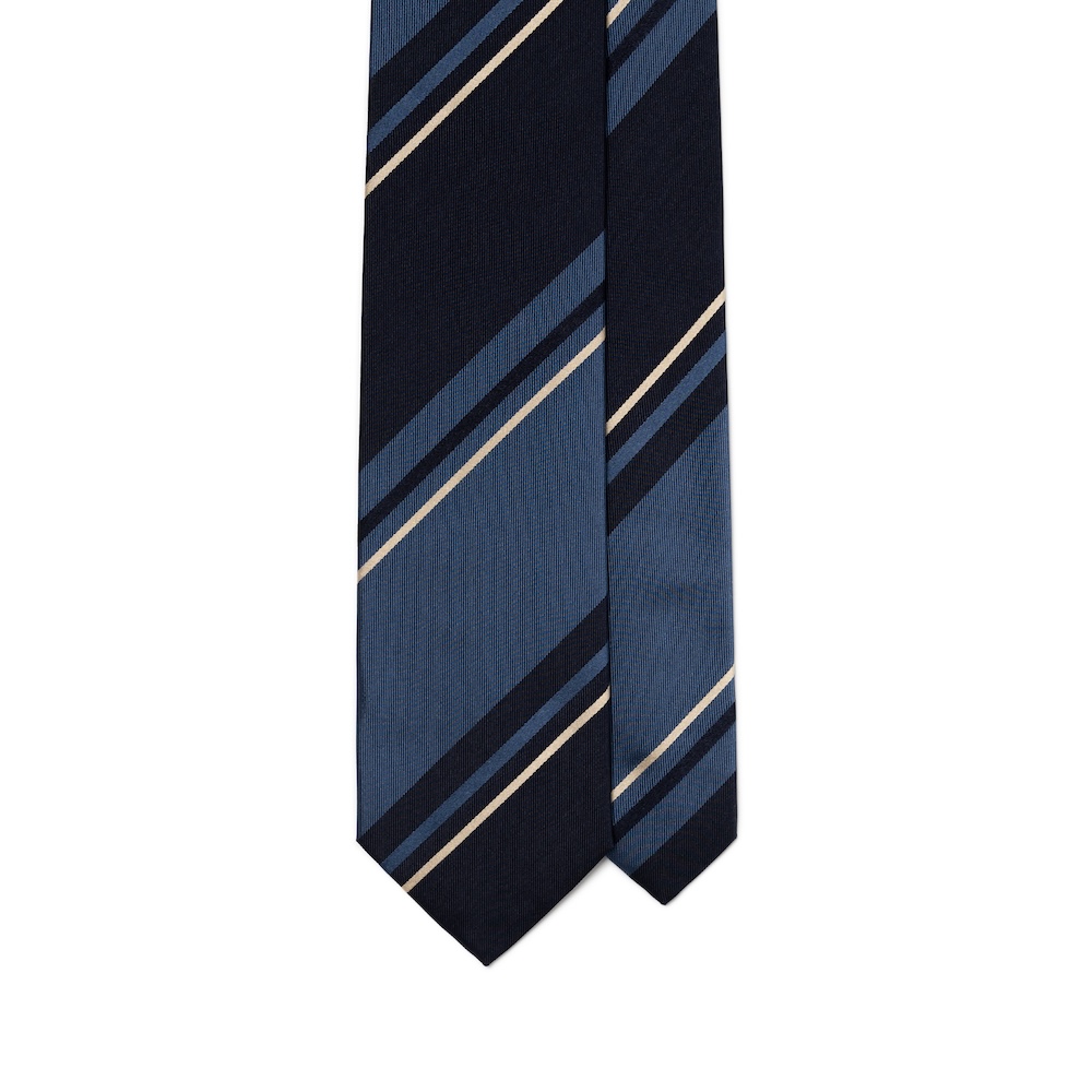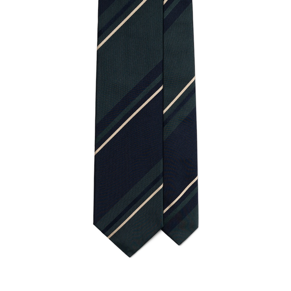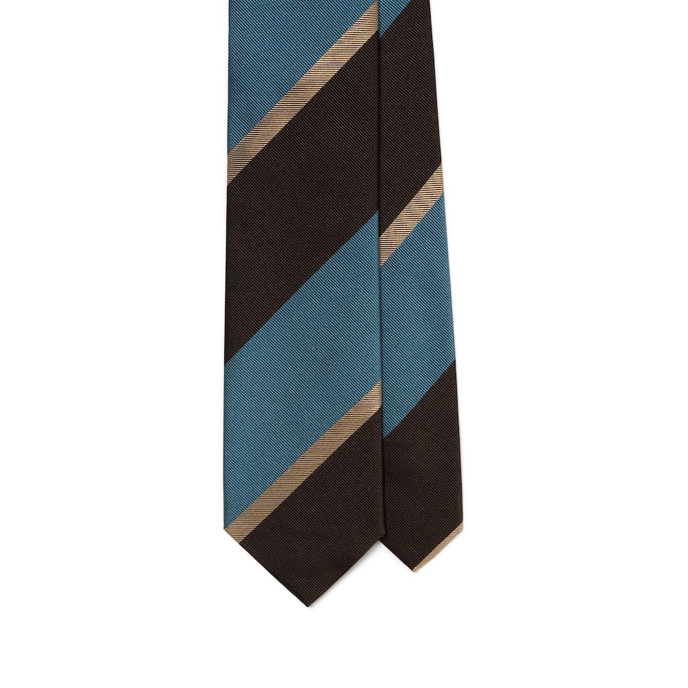 톤온톤 블루와 그린, 브라운 조합의 스트라이프 타이는 고전적인 무드와 함께 프랑코 바씨 특유의 색감 완성도를 보여줍니다. 여백이 있는 스트라이프 간격 덕분에 착용 시 넥타이 전체가 답답해 보이지 않고 포인트가 되는 인상을 줍니다.